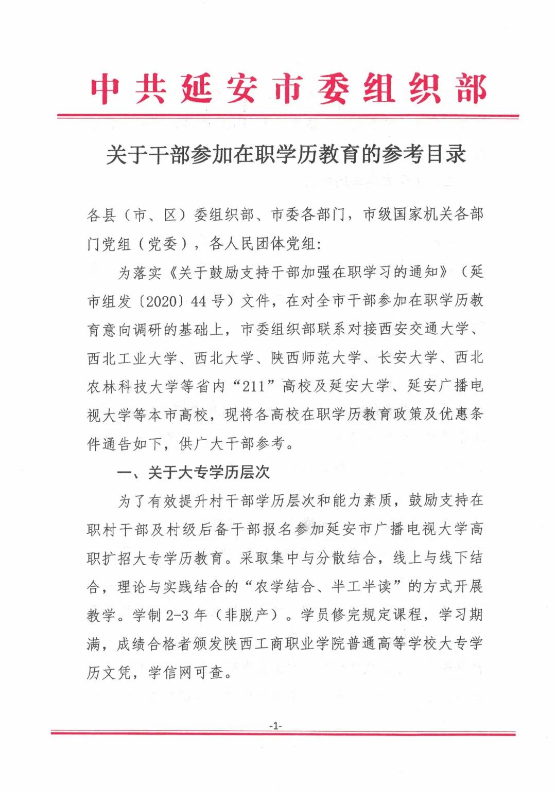 為積極拓寬生源渠道,現(xiàn)將延安市委組織部《關(guān)于干部參加在職學(xué)歷教育的參考目錄》轉(zhuǎn)發(fā)給你們,請按通知精神繼續(xù)做好招生工作,堅持以市場為導(dǎo)向,將招生貫穿于常年日常工作當(dāng)中,為我省的經(jīng)濟建設(shè)培養(yǎng)更多優(yōu)質(zhì)管理人才。