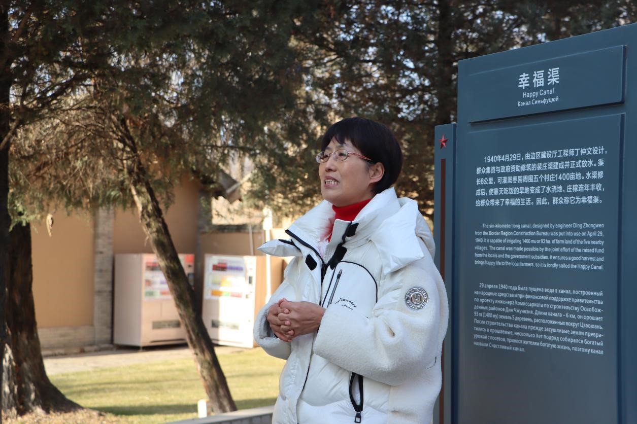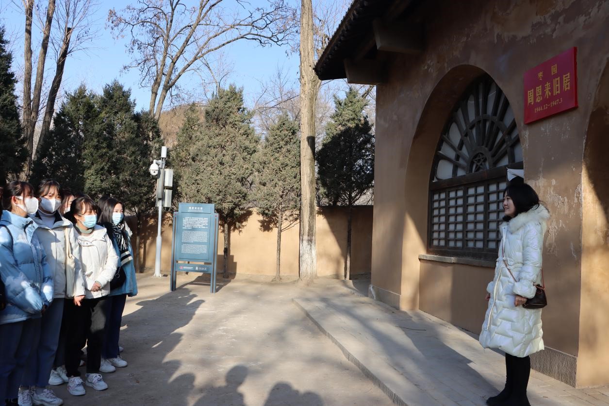 實(shí)踐活動(dòng)從延大新校區(qū)啟程,前往棗園革命舊址。首先,來(lái)到入口處的幸福渠,秦愛紅老師為大家介紹了幸福渠的由來(lái):1940年4月由邊區(qū)政府建設(shè)廳工程師丁仲文設(shè)計(jì)、當(dāng)?shù)厝罕娂Y與邊區(qū)政府資助興建,可以灌溉棗園周邊村莊1400畝地,水渠的建成使群眾的莊稼連年豐收,給群眾帶來(lái)了幸福生活,因而被當(dāng)?shù)厝罕姺Q為幸福渠。再往里走,經(jīng)過五大書記雕像,來(lái)到了中央領(lǐng)導(dǎo)人的舊居,卜姣老師和白如鈺老師分別講述了老一輩無(wú)產(chǎn)階級(jí)革命家在這生活這里生活、工作的細(xì)節(jié),讓大家感受到了到革命先輩們自力更生、艱苦奮斗的優(yōu)良傳統(tǒng)。