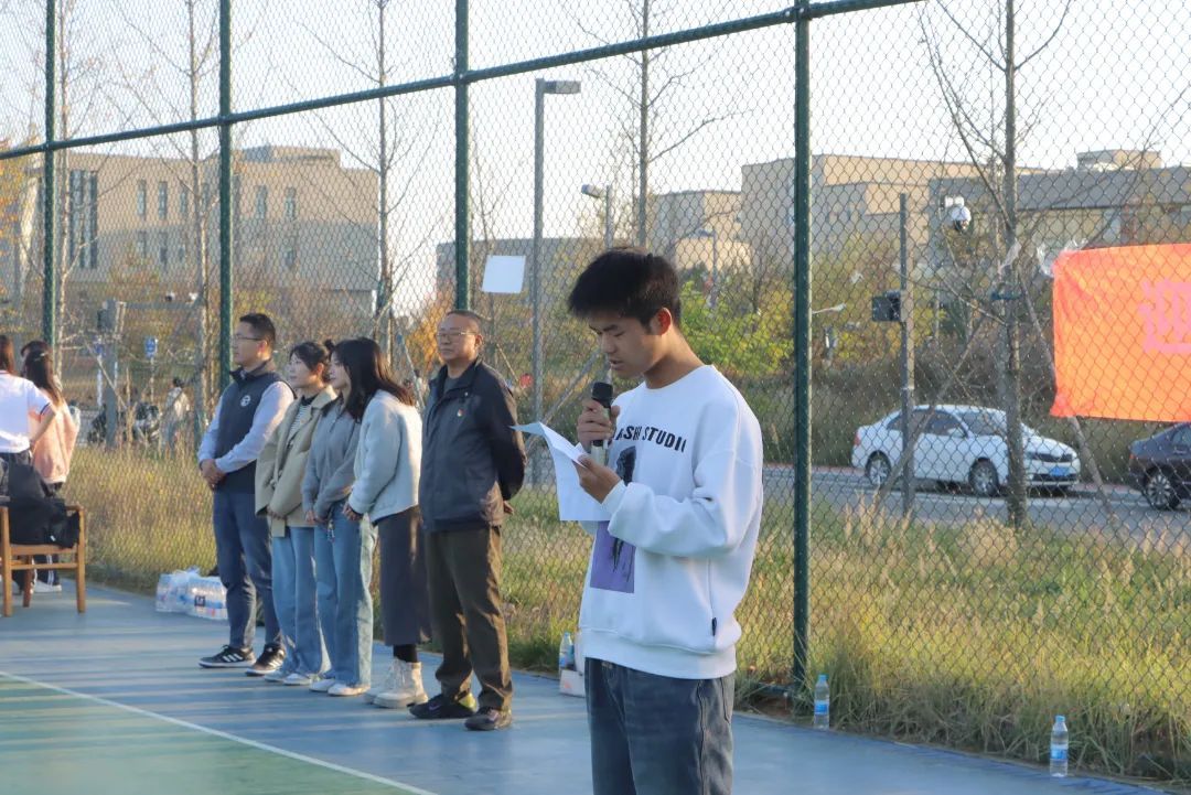 由工作人員代表吳鵬博同學(xué)發(fā)言:本次籃球比賽有我們?cè)谀缓蟊q{護(hù)航,這是一次精彩的籃球盛宴,我們也為這次比賽順利進(jìn)行而感到自豪。
