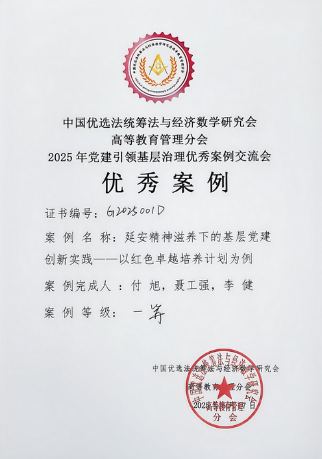 5月16日—18日,2025年高校管理學(xué)院/公共管理學(xué)院院長論壇暨中國優(yōu)選法統(tǒng)籌法與經(jīng)濟(jì)數(shù)學(xué)研究會高等教育管理分會學(xué)術(shù)年會”在延安舉行。此次會議由中國優(yōu)選法統(tǒng)籌法與經(jīng)濟(jì)數(shù)學(xué)研究會高等教育管理分會和延與安大學(xué)共同主辦,經(jīng)管學(xué)院與鄉(xiāng)村發(fā)展研究院共同承辦。按照議程,17日下午舉行了優(yōu)秀黨建案例交流會。我院黨委提交的黨建案例《延安精神滋養(yǎng)下的基層黨建創(chuàng)新實踐——以延安大學(xué)經(jīng)管學(xué)院“紅色卓越培養(yǎng)計劃”為例》,經(jīng)過專家評審,現(xiàn)場匯報,最終獲得黨建引領(lǐng)基層治理優(yōu)秀案例一等獎。