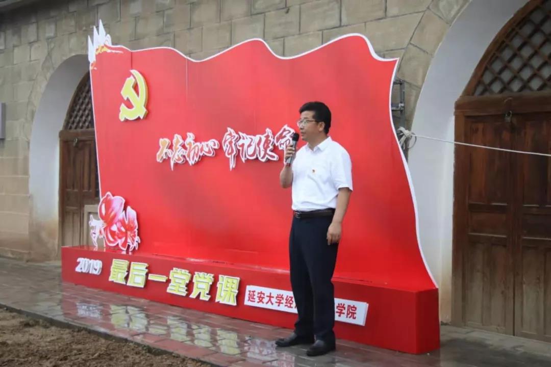 本網(wǎng)訊 6月27日下午,經(jīng)管學(xué)院2019屆畢業(yè)生黨員最后一堂黨課在清涼山陜北公學(xué)舊址舉行。副校長(zhǎng)楊偉宏參加活動(dòng)并為畢業(yè)生黨員講授黨課。經(jīng)管學(xué)院黨委書記姜慶、各學(xué)生黨支部書記以及82名畢業(yè)生黨員參加了此次活動(dòng),活動(dòng)由經(jīng)管學(xué)院黨委副書記冉曉輝主持。