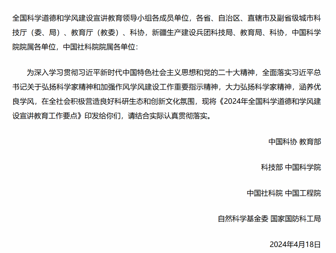 3.中國(guó)科協(xié) 教育部 科技部 中國(guó)科學(xué)院 中國(guó)社科院 中國(guó)工程院 自然科學(xué)基金委 國(guó)家國(guó)防科工局關(guān)于印發(fā)《2024年全國(guó)科學(xué)道德和學(xué)風(fēng)建設(shè)宣講教育工作要點(diǎn)》的通知