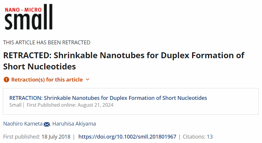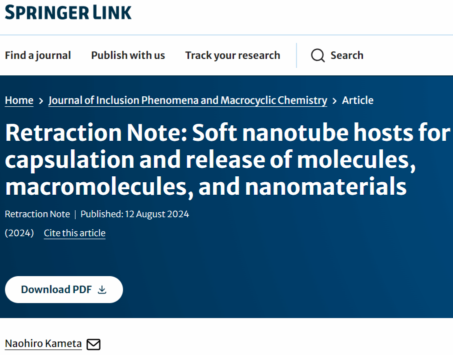 Naohiro Kameta,日本國(guó)家先進(jìn)工業(yè)科學(xué)技術(shù)研究所的知名研究人員,在Nanotubes(納米管)研究領(lǐng)域享有較高知名度。但是,近期Naohiro Kameta深陷學(xué)術(shù)造假的丑聞,其發(fā)表的3篇Small (IF=13)、1篇ACS Omega及1篇 Journal of Inclusion Phenomena and Macrocyclic Chemistry 文章由于偽造數(shù)據(jù)/異常而被撤稿。另外,由Naohiro Kameta參與的至少還有40篇文章,是否會(huì)有進(jìn)一步的問(wèn)題,還需要等雜志社進(jìn)一步處理,iNature編輯部會(huì)長(zhǎng)期關(guān)注。