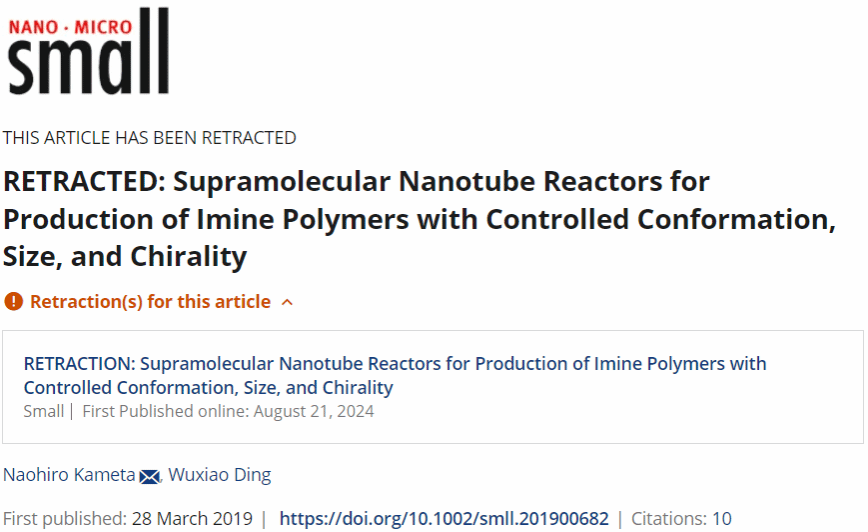 相關(guān)鏈接:RETRACTION: Supramolecular Nanotube Reactors for Production of Imine Polymers with Controlled Conformation, Size, and Chirality - Small - Wiley Online Library