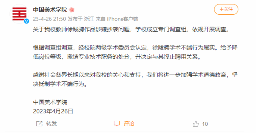 4月26日晚,中國(guó)美術(shù)學(xué)院官方微博發(fā)布消息稱(chēng),關(guān)于該校教師徐跋騁作品涉嫌抄襲問(wèn)題,學(xué)校成立專(zhuān)門(mén)調(diào)查組,依規(guī)開(kāi)展調(diào)查。根據(jù)調(diào)查組調(diào)查,經(jīng)校院兩級(jí)學(xué)術(shù)委員會(huì)認(rèn)定,徐跋騁學(xué)術(shù)不端行為屬實(shí)。給予降低崗位等級(jí)、撤銷(xiāo)專(zhuān)業(yè)技術(shù)職務(wù)的處分,并決定與其終止聘用關(guān)系。