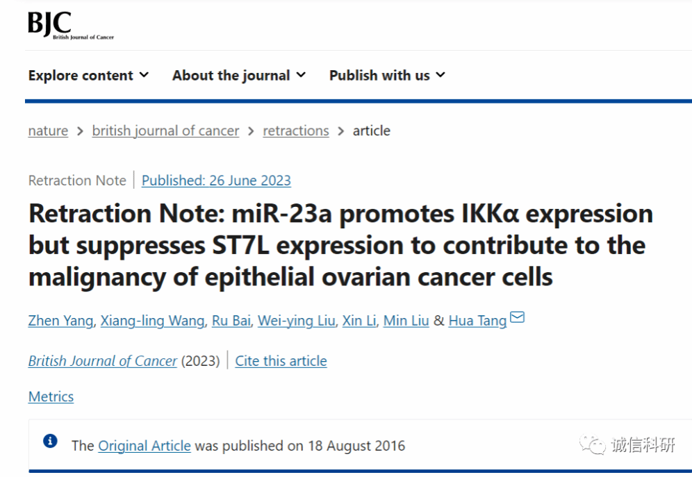 2016年8月18日,天津醫(yī)科大學(xué)湯華團(tuán)隊(duì)在British Journal of Cancer(IF=9.08)在線(xiàn)發(fā)表題為”miR-23a promotes IKKα expression but suppresses ST7L expression to contribute to the malignancy of epithelial ovarian cancer cells“的研究論文,該研究miR-23a作為癌基因通過(guò)靶向IKKα和ST7L,從而促進(jìn)EOC細(xì)胞的惡性。但是,在2023年6月26日,該文章被撤回,主要原因是文章涉嫌圖片重復(fù)使用。另外,國(guó)自然基金委對(duì)湯華共通報(bào)了32篇文章(點(diǎn)擊閱讀),其中截至2022年6月28日,已經(jīng)被撤稿12篇文章(點(diǎn)擊閱讀)。撤銷(xiāo)湯華國(guó)家自然科學(xué)基金項(xiàng)目“Hsa-miR-10a抑制結(jié)腸癌轉(zhuǎn)移的分子機(jī)制研究”(批準(zhǔn)號(hào)30873017)、“在卵巢癌細(xì)胞中miRNA與TNF-α-IKK-NF-κB信號(hào)途徑基因的相互調(diào)控作用研究”(批準(zhǔn)號(hào)91029714)、“miR-372調(diào)控宮頸癌細(xì)胞周期的機(jī)制研究”(批準(zhǔn)號(hào)31071191)、“PSMC3對(duì)Ago2穩(wěn)定性的調(diào)節(jié)及其機(jī)制研究”(批準(zhǔn)號(hào)31270818)、“肝癌細(xì)胞中miR-615-5p的表觀遺傳調(diào)控及功能機(jī)制研究”(批準(zhǔn)號(hào)81572790)、“炎性因子激活NF-κB/STAT3通過(guò)表觀遺傳修飾調(diào)控腫瘤細(xì)胞惡性行為及前轉(zhuǎn)移微環(huán)境形成的機(jī)制研究”(批準(zhǔn)號(hào)91629302)、“HPVE6/E7調(diào)控METTL3所介導(dǎo)的m6A-RNA在宮頸癌細(xì)胞中的作用與機(jī)制研究”(批準(zhǔn)號(hào)81830094),追回上述7個(gè)項(xiàng)目已撥資金,取消湯華國(guó)家自然科學(xué)基金項(xiàng)目申請(qǐng)資格5年(2022年1月18日至2027年1月17日),給予湯華通報(bào)批評(píng)。
