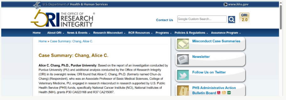 美國(guó)研究誠(chéng)信辦公室(ORI)將2022年最重的一起學(xué)術(shù)不端處罰,施加給一位華人學(xué)者Alice C. Chang。在長(zhǎng)達(dá)10年時(shí)間里,禁止她申請(qǐng)任何美國(guó)政府撥款的基金項(xiàng)目。