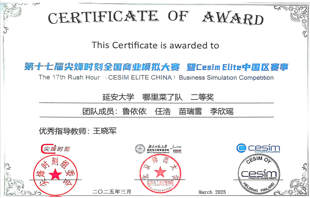 3月28日至30日,第十七屆 “尖烽時刻”全國商業(yè)模擬大賽總決賽在北京師范大學(xué)舉行。由延安大學(xué)會計(jì)碩士與工商管理碩士研究生魯依依、任浩、苗瑞雪、李欣瑤組成的“哪里菜了隊(duì)”歷經(jīng)初賽、復(fù)賽以及三天的總決賽,從全國170所高校的2000多支隊(duì)伍中脫穎而出,獲得全國研究生組二等獎。